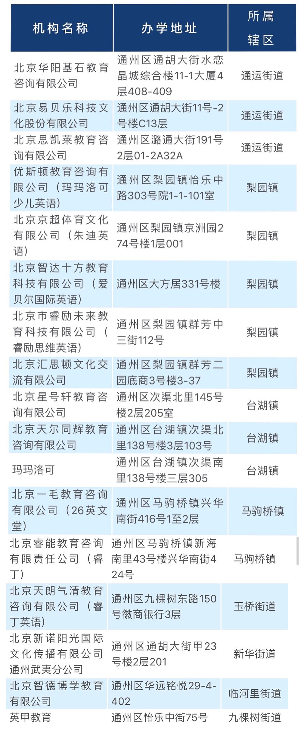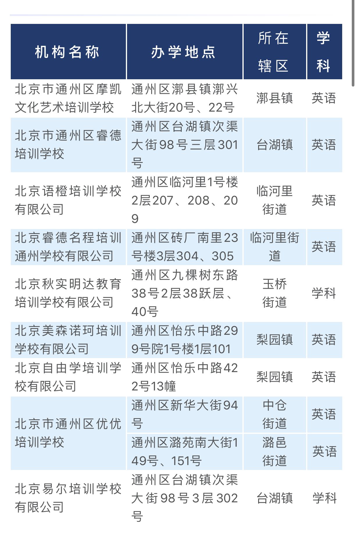 这9家(10址)机构分别是通州区摩凯文化艺术培训学校、通州区睿德培训学校、北京语橙培训学校、北京睿德名程培训通州学校、北京秋实明达教育培训学校、北京美森诺珂培训学校、北京自由学培训学校、通州区优优培训学校(两址)、北京易尔培训学校。其中7家机构的培训内容为英语,两家为学科。
