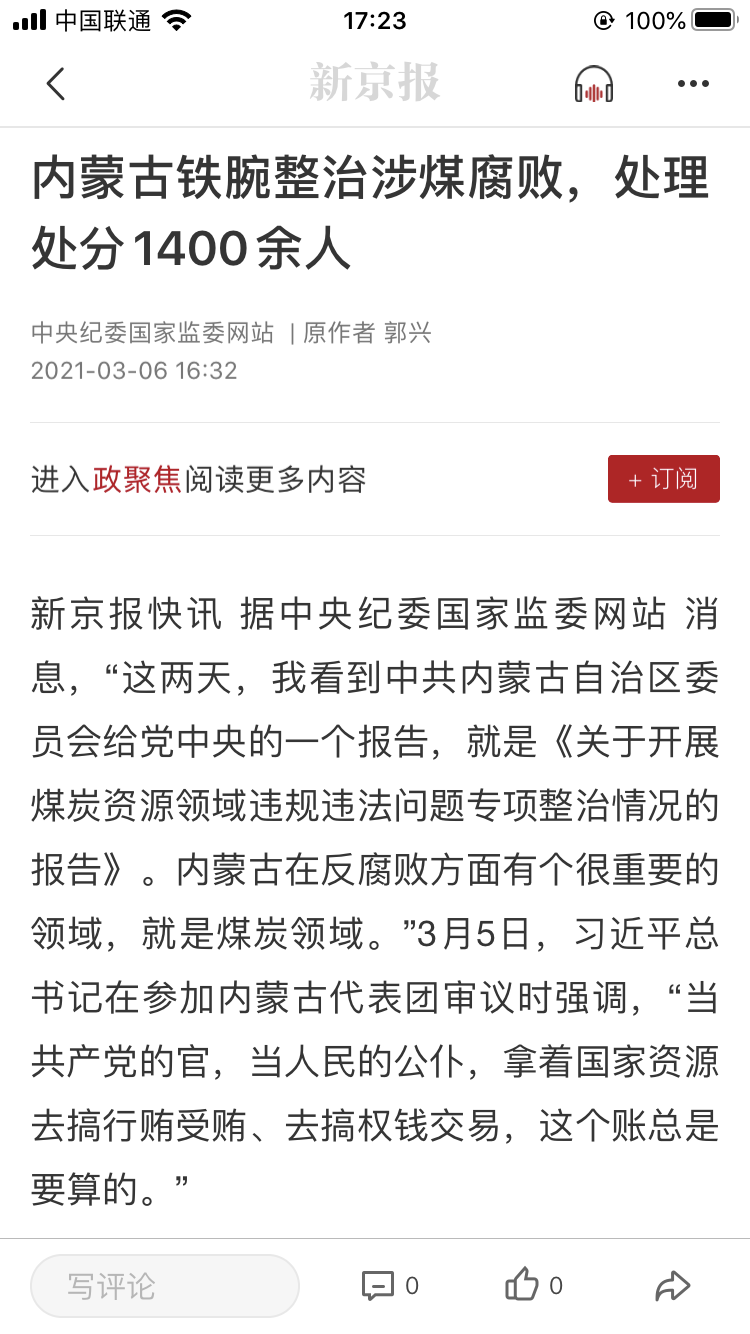 ▲新京报关于《内蒙古铁腕整治涉煤腐败,处理处分1400余人》的报道截图。