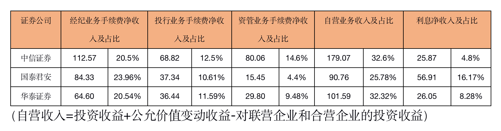 整体来看,在头部券商中,自营业务和经纪业务依然是券商最为重磅的两大业务之一,但是自营业务已经牢牢站稳了“C位”。中信证券、国泰君安和华泰证券的自营业务收入占总收入的比重均处于首位。