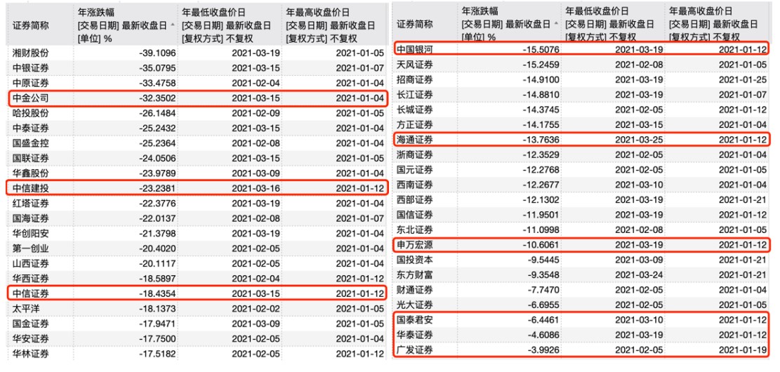 值得注意的是,这些头部券商股的年内收盘最高价多在1月份,尤其是1月12日,而年内收盘最低价格均在近两周出现。