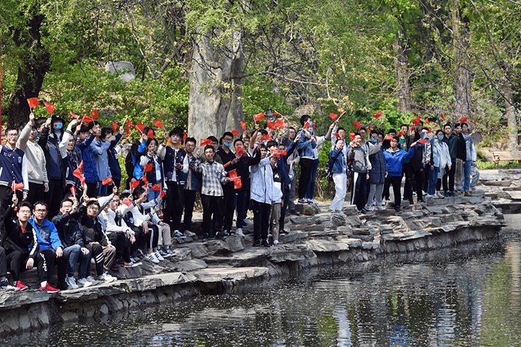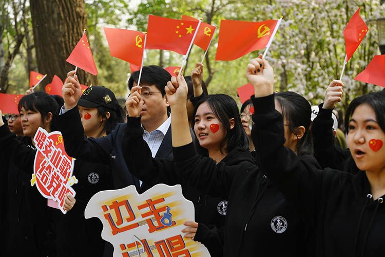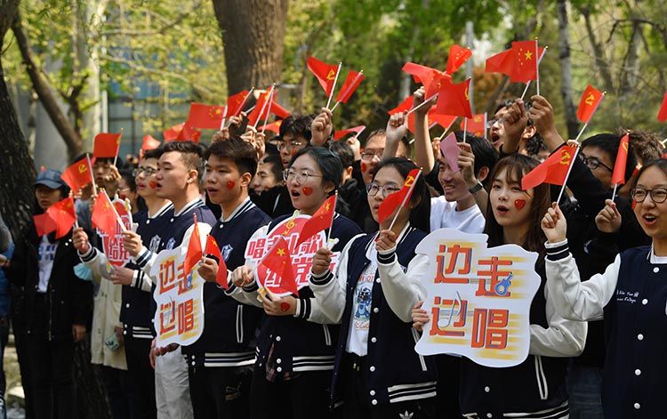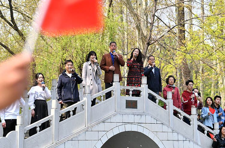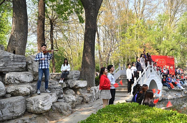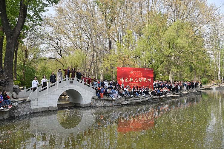 4月8日中午,北京航空航天大学学院路校区,绿园荷花池畔响起悠扬乐声,人群逐渐聚集,大家跟随领唱齐声高歌,为庆祝中国共产党成立100周年献上最真挚的祝福。