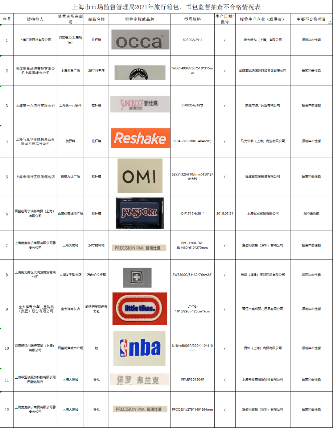不合格产品经营者所在地包括巴黎春天(五角场店)、上海世贸广场、上海第一八佰伴、美罗城、颛桥万达广场、百盛优客城市广场、上海大悦城、大润发平型关店、宝大祥南东店9家商场、超市。例如,百盛纽可尔瑞特商贸(上海)有限公司在百盛优客城市广场销售的标称由上海冠军贸易有限公司生产(或销售)的“JANSPORT”牌拉杆箱(型号规格:C-F1715H/28;生产日期或批号:2018.07.31),耐冲击性能测试后,前大面左上角开裂,后大面上方左右两角均变形。