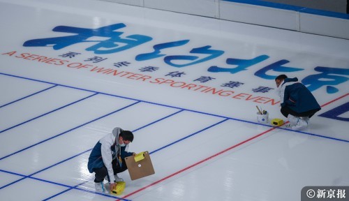 4月8日,国家速滑馆 工作人员在摆放计时设备。新京报记者 陶冉 摄