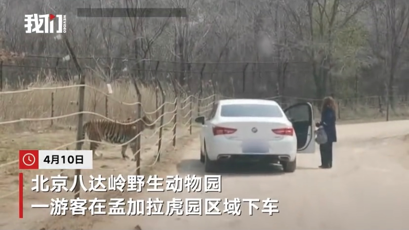 ▲游客在孟加拉虎园区域下车遭“虎视眈眈” 。图片来源:新京报我们视频截图