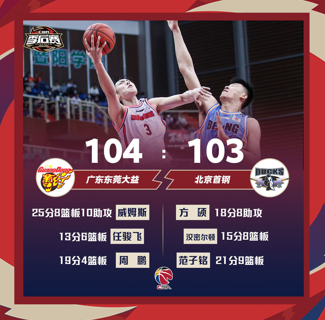 广东队末节前半段只让首钢队得到4分,打出一波10比0化被动为主动。得到全队最高分(25分)的威姆斯末节贡献11分,最后时刻频频冲击对手篮筐得分,最终以“准绝杀”帮助球队翻盘。