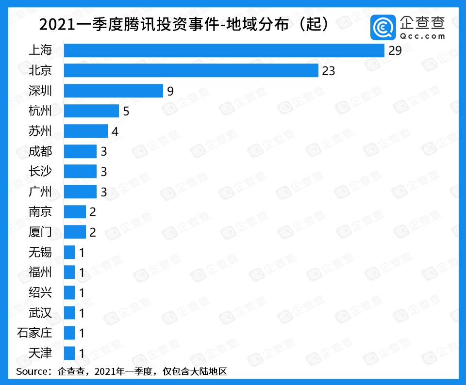从地域分布来看,企查查数据显示,2021年一季度上海、北京分别以29起和23起融资事件稳居腾讯对外投资的第一梯队,深圳、杭州、苏州紧跟其后。
