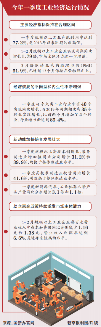 黄利斌介绍,宏观数据显示,一季度规模以上工业增加值同比增长24.5%,两年平均增速6.8%,环比增长2.01%;工业产能利用率达到77.2%,是2013年以来同期的最高值。“工业生产总体基本恢复到疫情前的正常水平。”