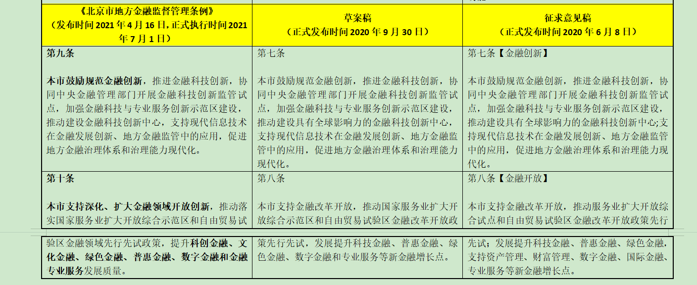相较征求意见稿(2020年6月8日发布)、草案稿(2020年9月30日发布),记者注意到,条例在多章做出调整。但是关于“金融创新”与“金融开放”,从征求意见稿、草案稿再至条例发布稿,内容上除个别字句的微调外,被整体保留。