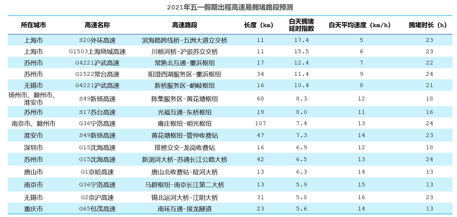 5月1日,全国高速出程较易拥堵的路段主要有S20外环高速上海段,白天拥堵延时指数达17.4,平均速度约为5千米/小时;其次是G1503上海绕城高速上海段以及G4221沪武高速苏州段。5月5日,全国高速返程较易拥堵的路段主要有S49新扬高速宿迁、淮安段,白天拥堵延时指数达10.2,平均速度约为9千米/小时;其次是G36宁洛高速滁州段以及G40沪陕高速六安、合肥段。