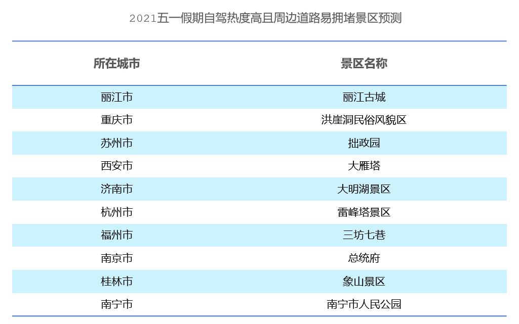 出游之际,景区周边路况也是游客关心的内容。报告预测,丽江古城、洪崖洞民宿风貌区和拙政园,将成为五一假期自驾热度高且周边道路易拥堵的景区前三名。高德地图建议游客尽量提前做好停车规划或选择打车和公共交通出行。