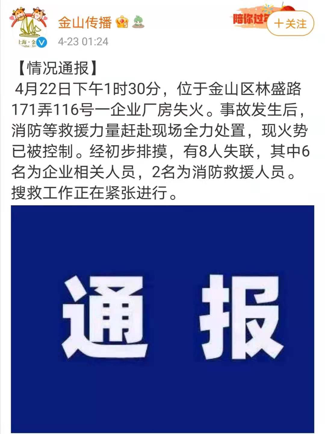 新京报讯(记者 刘瑞明 实习生 汪媛)4月22日13时30分许,上海市金山区一企业厂房失火。23日1时24分,金山区人民政府新闻办公室官方微博“金山发布”通报称,经初步摸排,8人失联,其中6名为企业相关人员,2名为消防救援人员。火势已被控制,搜救工作正在紧张进行。