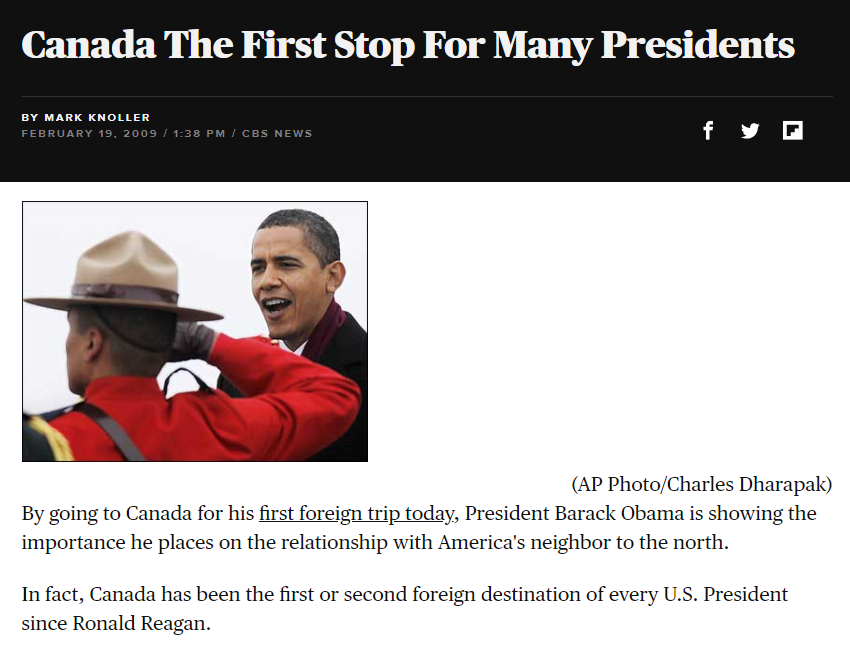 加拿大曾是许多美国总统的外访第一站。/CBS报道截图