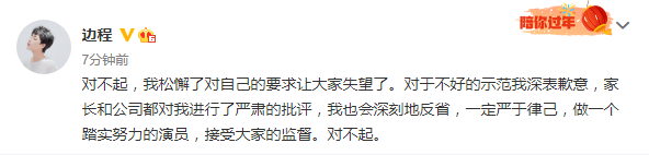演员边程就未成年吸烟一事道歉,之后会严于律己