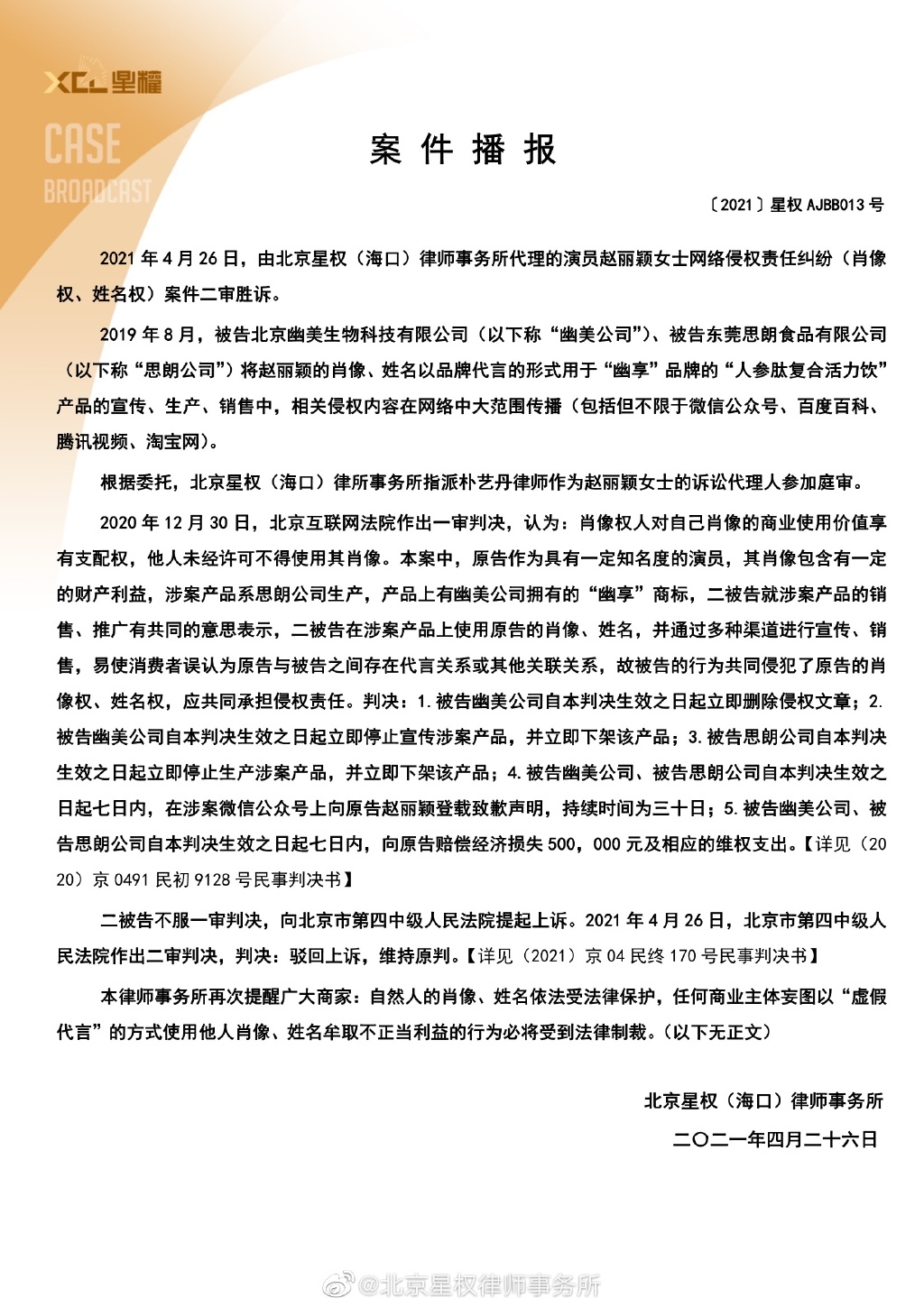 新京报讯 4月26日晚,北京星权律师事务所发布案件播报,演员赵丽颖诉北京**生物科技有限公司、东莞**食品有限公司网络侵权责任纠纷(肖像权、姓名权)案件二审胜诉。