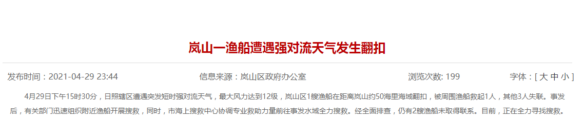 强对流天气致山东日照1艘渔船翻扣 2艘渔船失联