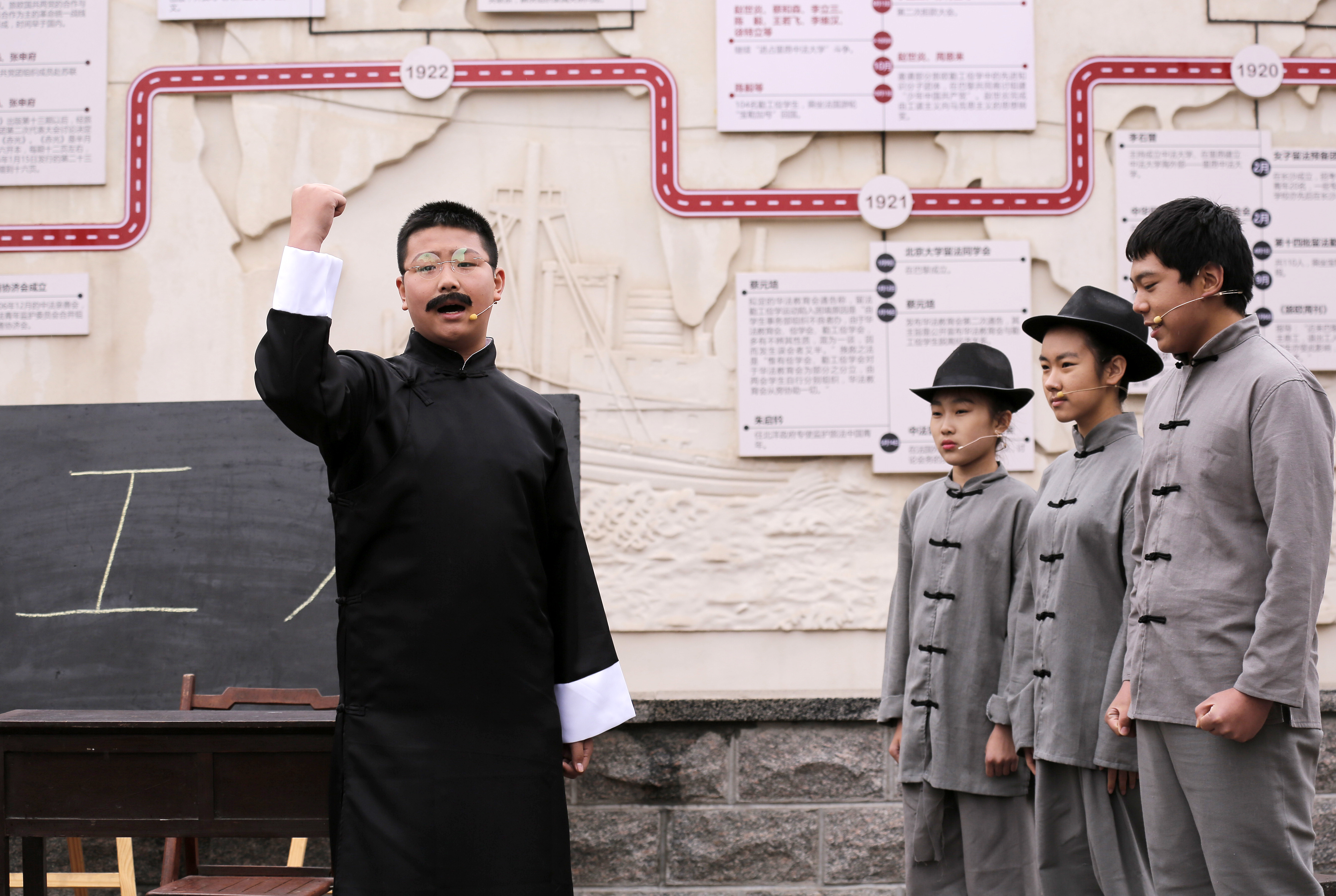 新京报讯(记者 冯琪)“‘工’字和‘人’字加在一起是什么字?是天!”4月30日,在长辛店留法勤工俭学预备班旧址,北京市丰台区长辛店第一中学学生演员们扮演李大钊、邓中夏和工友们,还原了百年前党史上的重要一幕。这是丰台区教育系统开展的“探寻红色开端之地 讲述百年青春故事”实景微团课——《工人是天》。