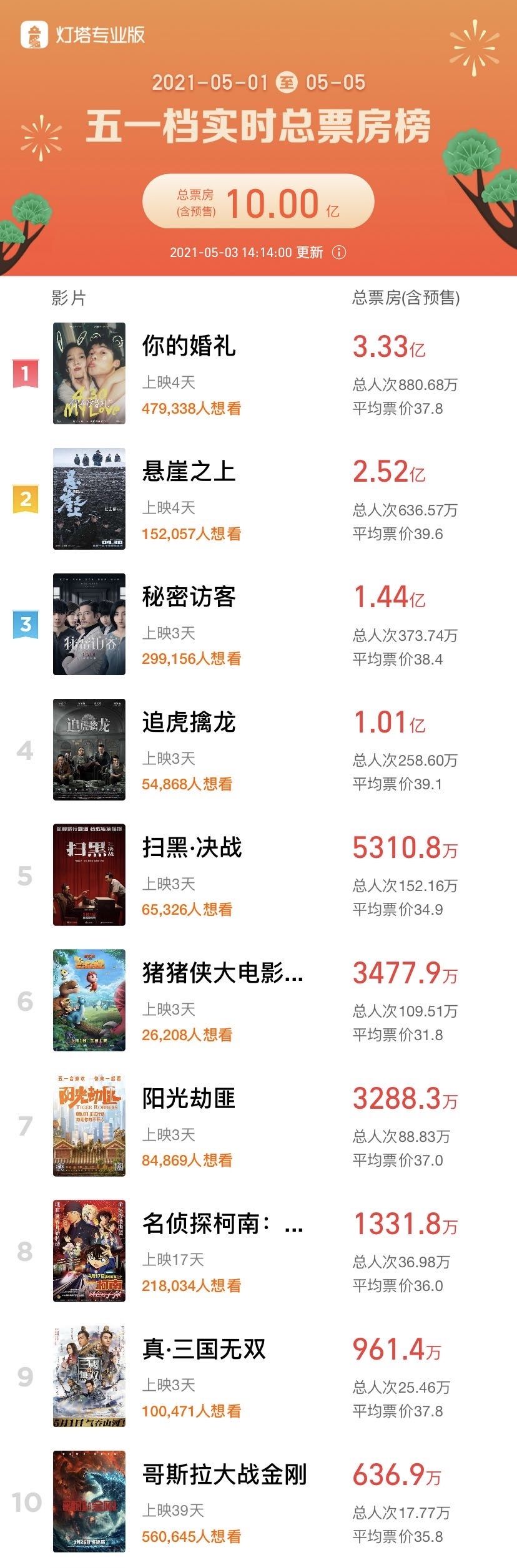 五一档总票房破10亿,《悬崖之上》逆袭《你的婚礼》