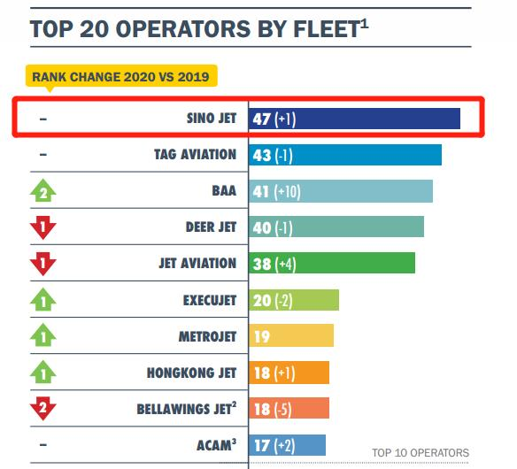 《报告》显示,亚太地区前20家运营商的机队占总数额的34%,其中14家是大中华地区的运营商。在去年全球公务机市场受到极大冲击的情况下,中国公务机市场保持着稳健增长。