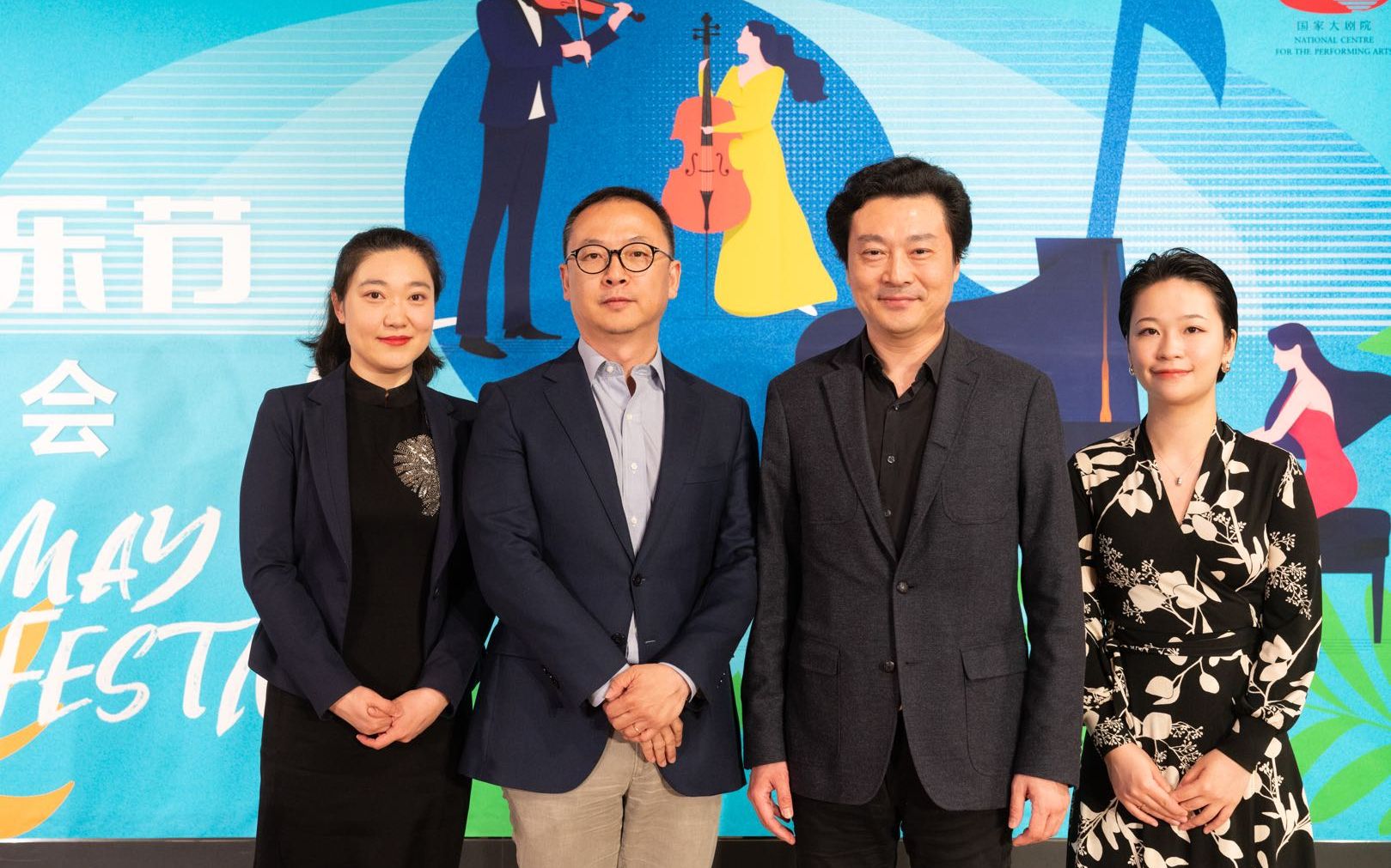 左起:国家大剧院演出部副部长王路藜、国家大剧院管弦乐团总经理任小珑、五月音乐节艺术总监吕思清、青年小提琴家党华莉在新闻发布会合影。摄影:牛小北