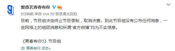 新京报快讯 据@爱奇艺青春有你微博消息,目前,节目组决定终止节目录制,取消决赛。到此节目组没有公布任何消息,一些网络上的组团消息和所谓“官方微博”均为不实信息。