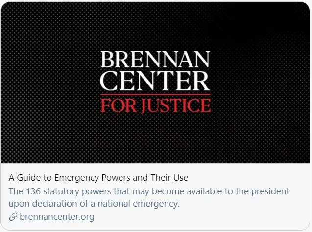 纽约大学法学院布伦南司法研究中心指出,美国总统在宣布国家进入紧急状态方面有较为广泛的自由裁量权。《美国全国紧急状态法》正式赋予美国总统宣布国家进入紧急状态的权力,并提出程序性要求,但没有详细具体说明在何种条件下,总统可以宣布紧急状态。在国家紧急状态期间,总统至少有136项法定权力,包括没收财产、实施戒严等。