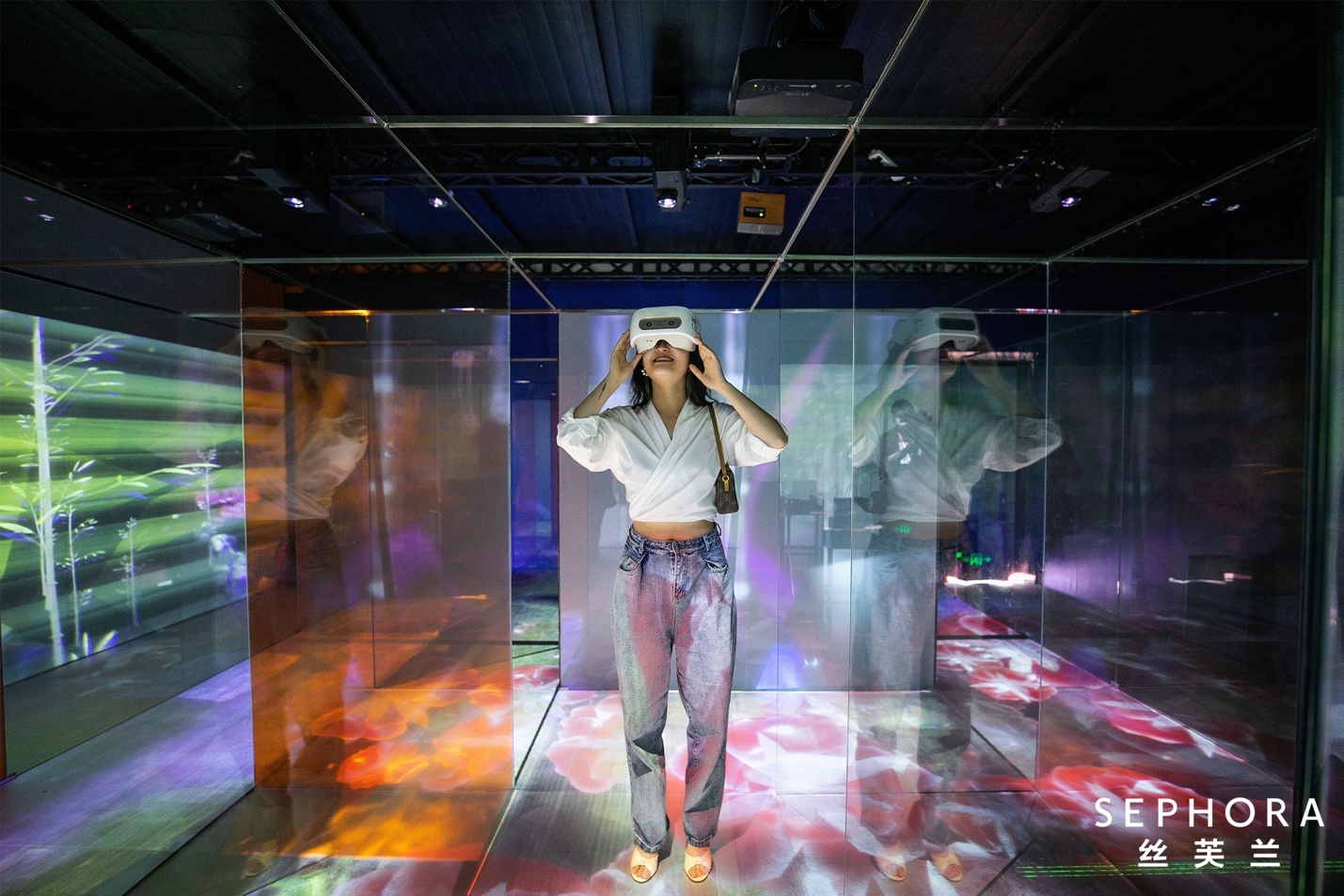 此外,在太古里旗舰店的限时路演区域中,陈抱阳还借力虚拟现实技术,为公众搭建了一座实体的百花迷宫。戴上VR眼镜,光影交错间,便可以徜徉在茫茫花海之中。