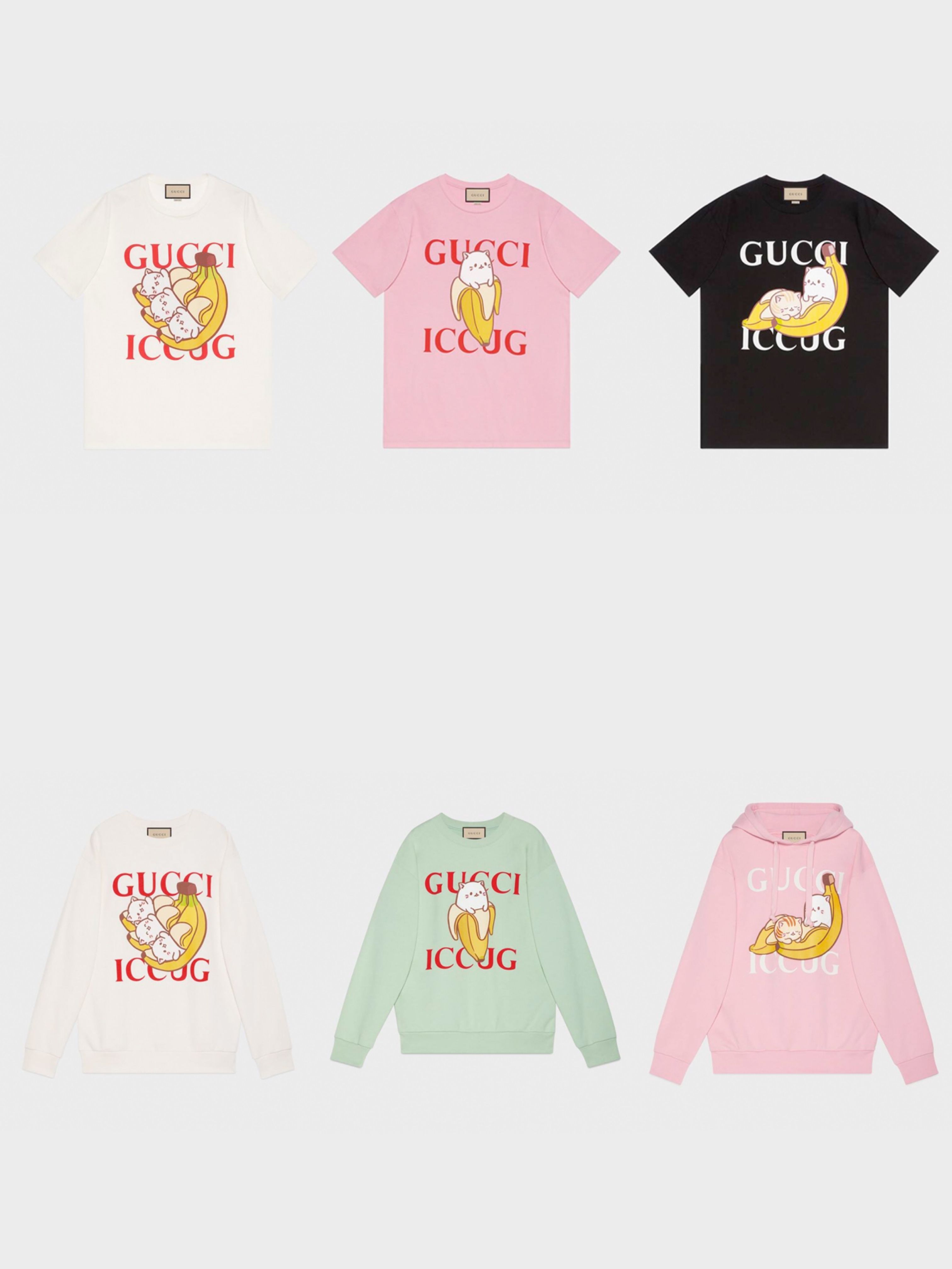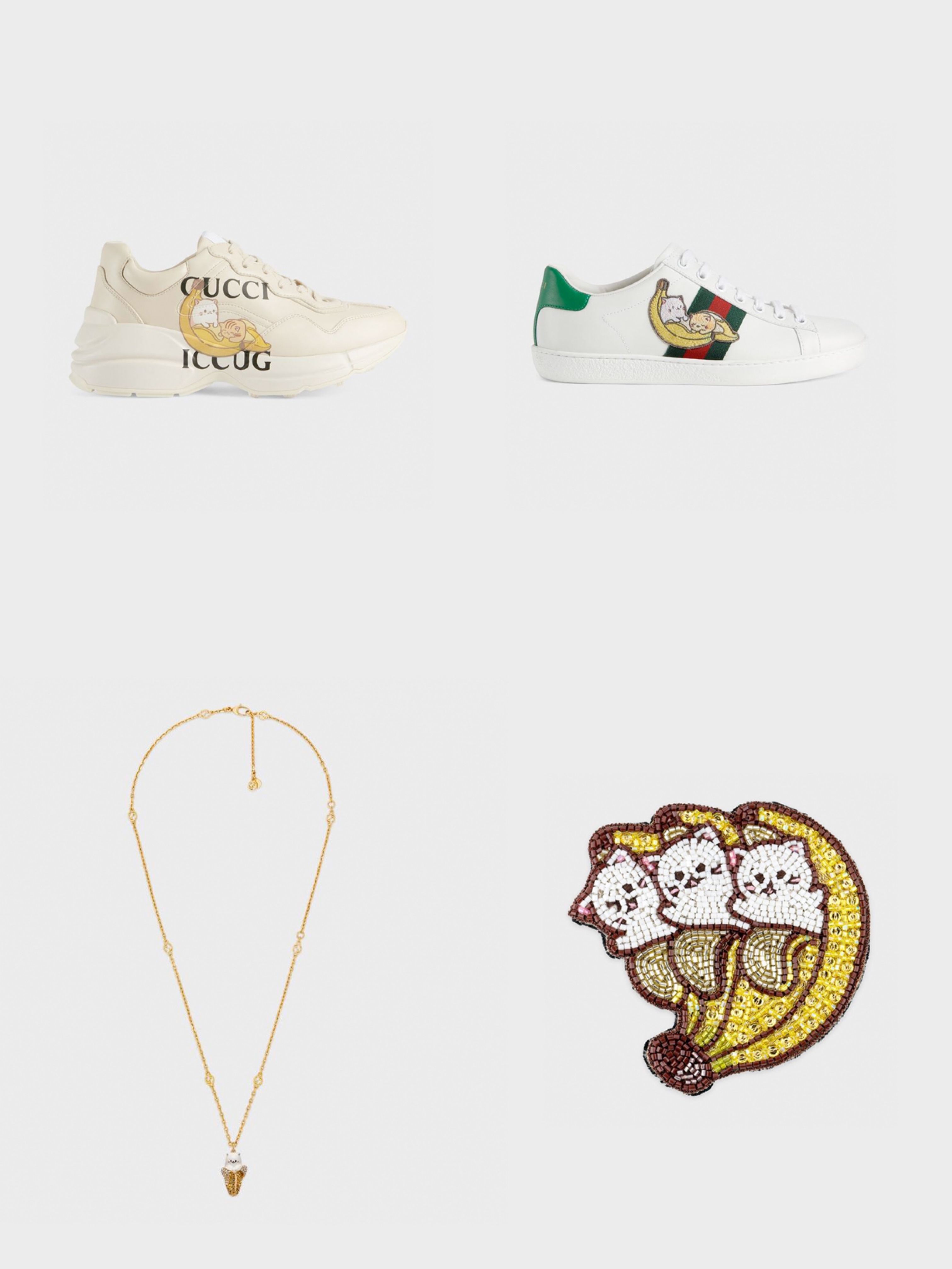此次Gucci与《香蕉喵 Bananya》的合作,推出了卫衣、T-Shirt、老爹鞋,还有胸针、项链等饰品,香蕉喵与Gucci的Logo结合,一点也不违和,反而比之前的一些卡通联名更出众。