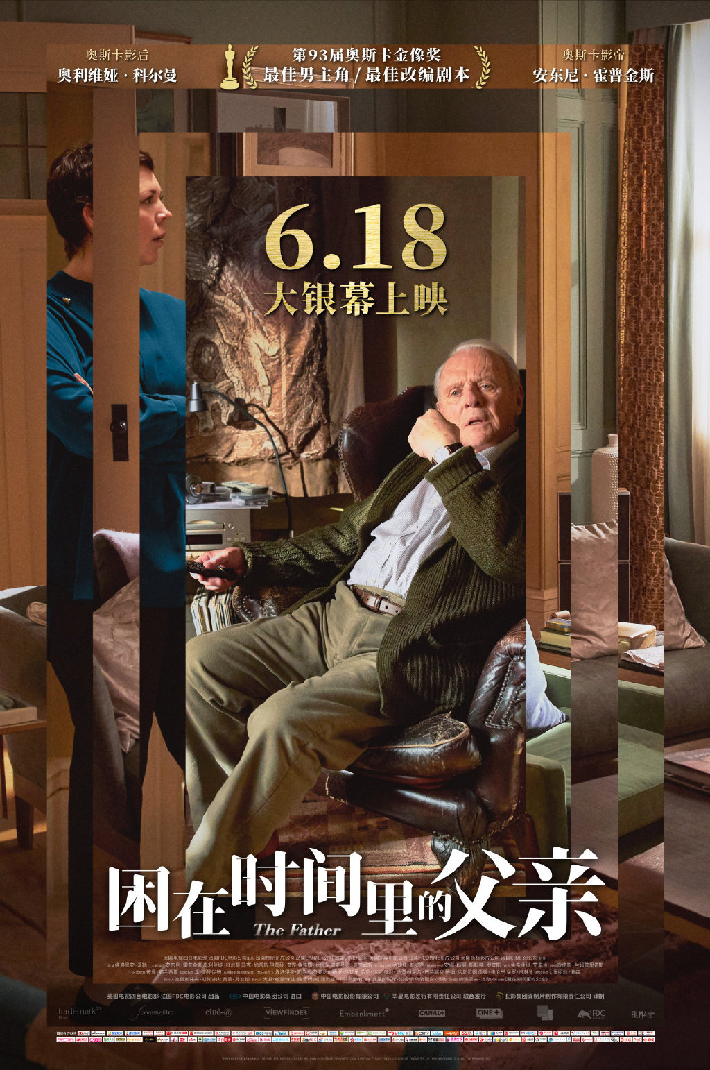 海报中,父亲安东尼斜坐在自家公寓中,神色迷茫;女儿安妮(奥利维娅·科尔曼饰)虽侧立于旁却身处另一空间。一连串重叠错落的空间将安东尼嵌入其中,同时也困住了安妮,暗喻了深陷在失序时空中患病老人的无助与迷茫。