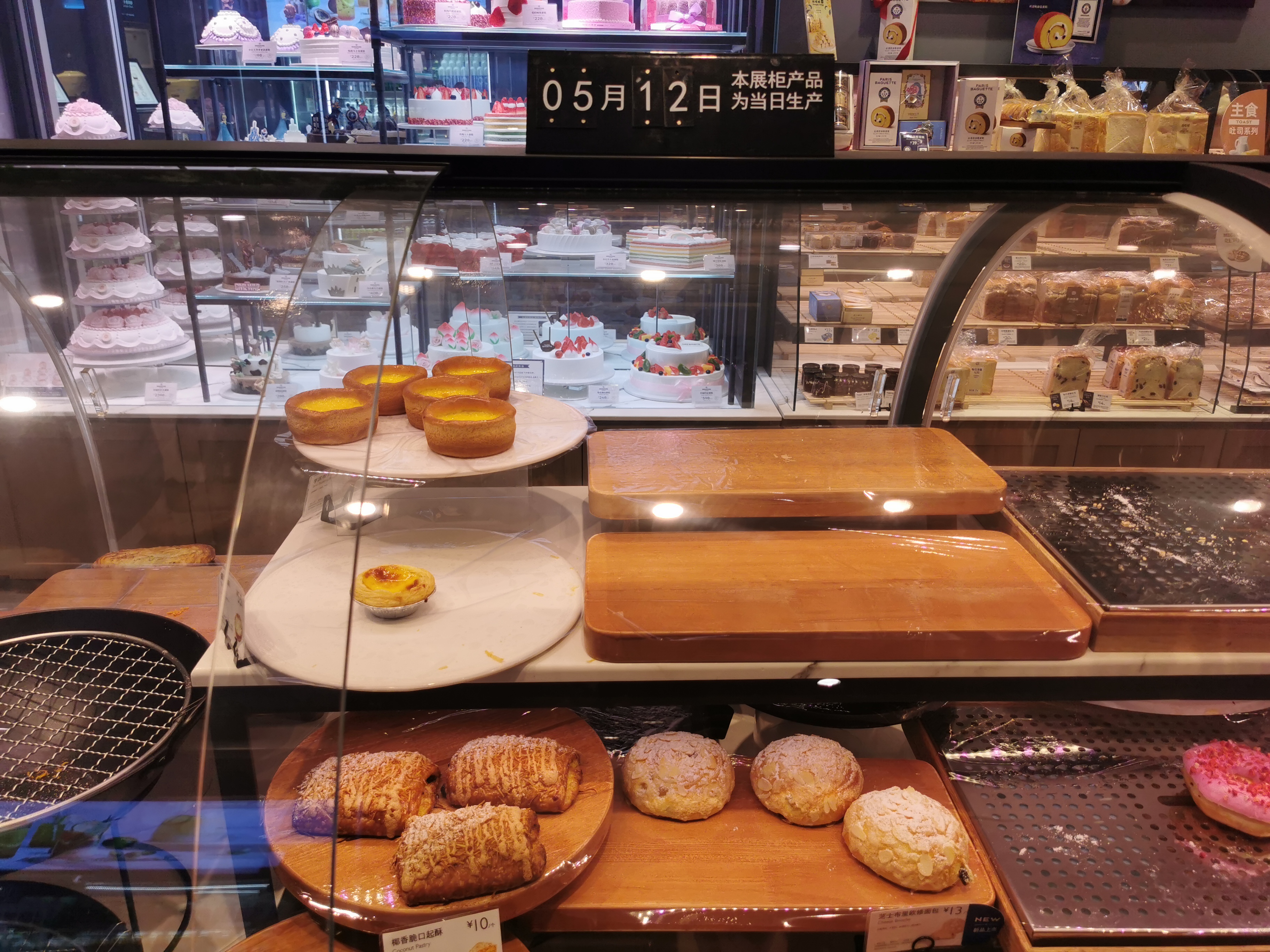 新京报记者5月12日走访北京地区爸爸糖手工吐司、巴黎贝甜门店发现,店内均在醒目位置对现场制售产品的生产日期进行了提示。据工作人员介绍,除保质期相对较长的预包装产品外,店内部分现场制售的烘焙产品如当天消耗不完,均需按公司规定做报废处理,无论门店是直营还是加盟模式。