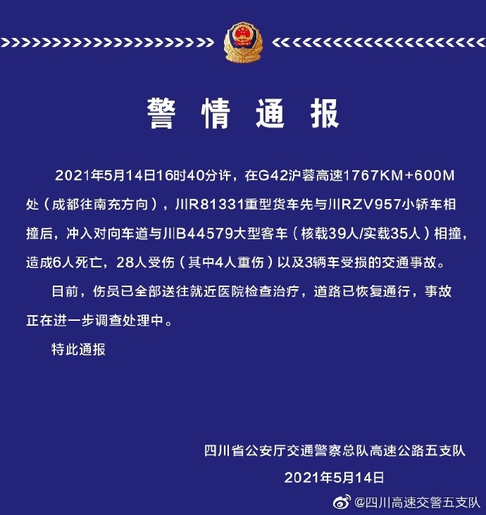 新京报快讯 据四川省公安厅交通警察总队高速公路五支队官方微博消息 , 2021年5月14日16时40分许,在G42沪蓉高速1767KM+600M处(成都往南充方向),川R81331重型货车先与川RZV957小轿车相撞后,冲入对向车道与川B44579大型客车(核载39人/实载35人)相撞,造成6人死亡,28人受伤(其中4人重伤)以及3辆车受损的交通事故。