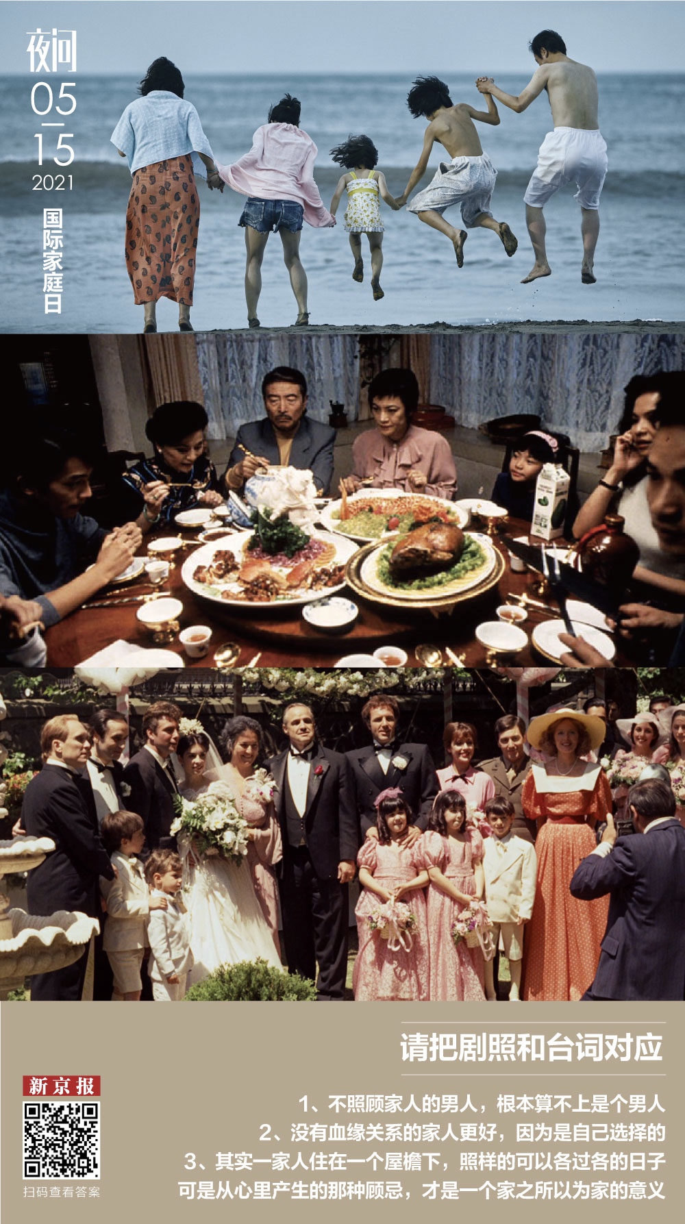 答案:图一是电影《小偷家族》对应2,图二是电影《饮食男女》对应3,图三是电影《教父》对应1。