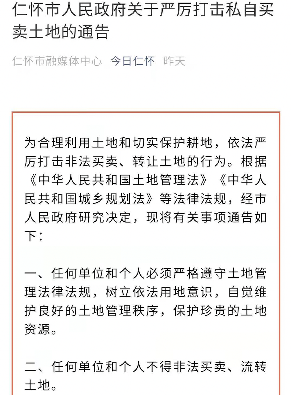 新京报讯 仁怀市融媒体中心5月15日消息显示,仁怀市人民政府发布关于严厉打击私自买卖土地的通告,有观点称此举有助于仁怀市当地白酒产业的合理有序发展,也能保障当地白酒原料所需耕地。