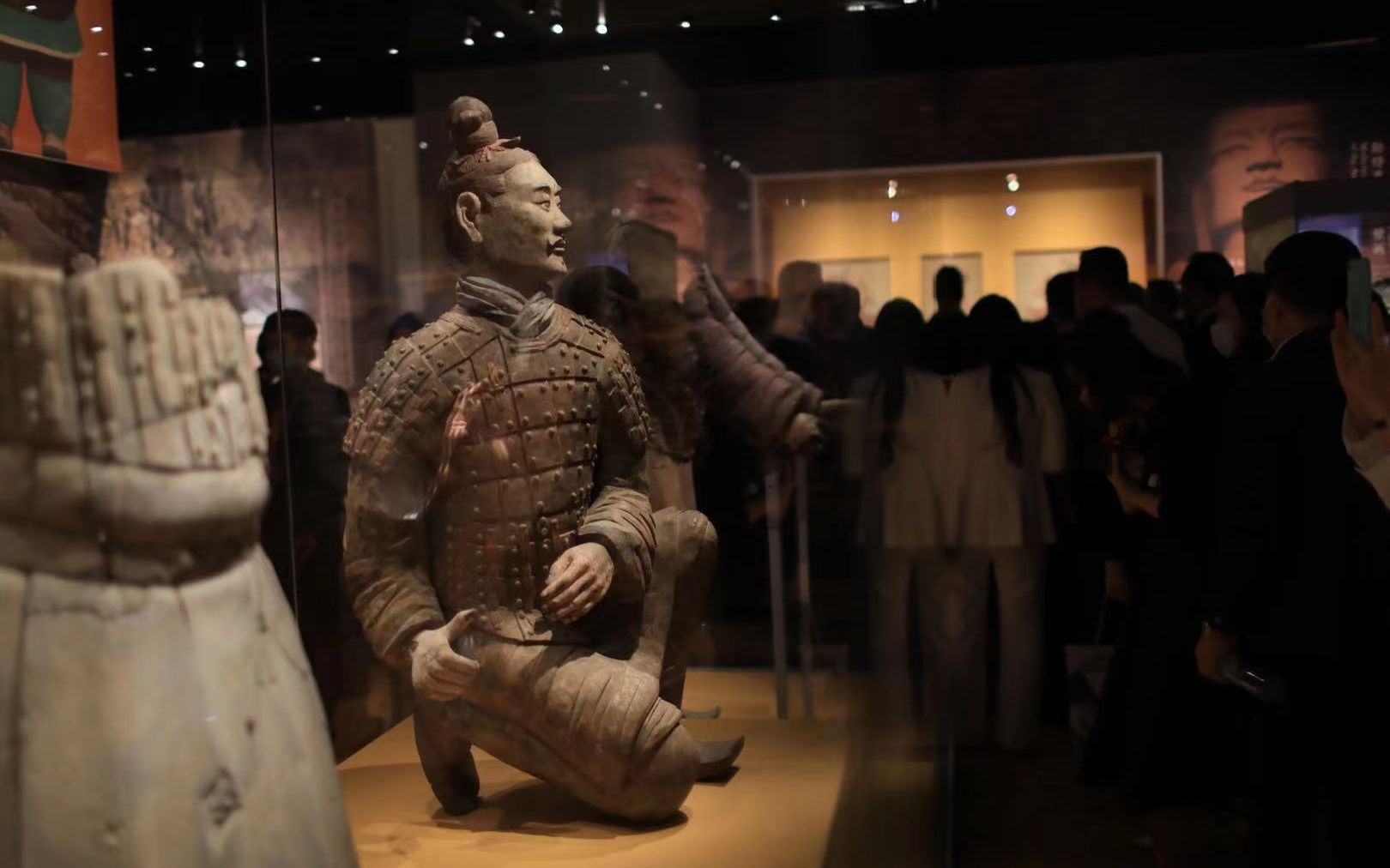 展览汇集10个省市、23家文博单位的50余件(套)文物及相关辅助展品,其中不乏国之重器,有近年来重要的考古发现,还有通过科学研究复原的精美复原件,包括秦始皇帝陵出土彩绘兵马俑、甘肃张家川马家塬战国墓地M16-2号车(复原件)、蒋懋德画山水图贴落、浙江浦江上山遗址出土碳化稻米等。