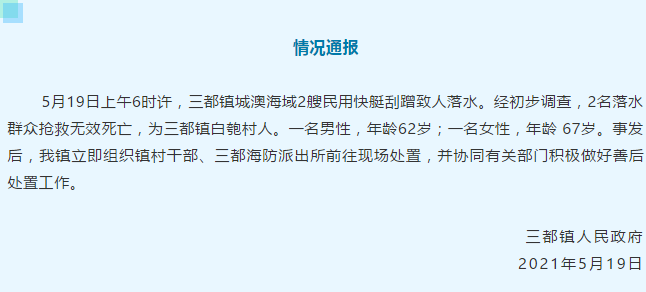 新京报快讯 据宁德市蕉城区新闻中心官微消息,5月19日上午6时许,三都镇城澳海域2艘民用快艇刮蹭致人落水。经初步调查,2名落水群众抢救无效死亡,为三都镇白匏村人。一名男性,年龄62岁;一名女性,年龄 67岁。事发后,三都镇立即组织镇村干部、三都海防派出所前往现场处置,并协同有关部门积极做好善后处置工作。