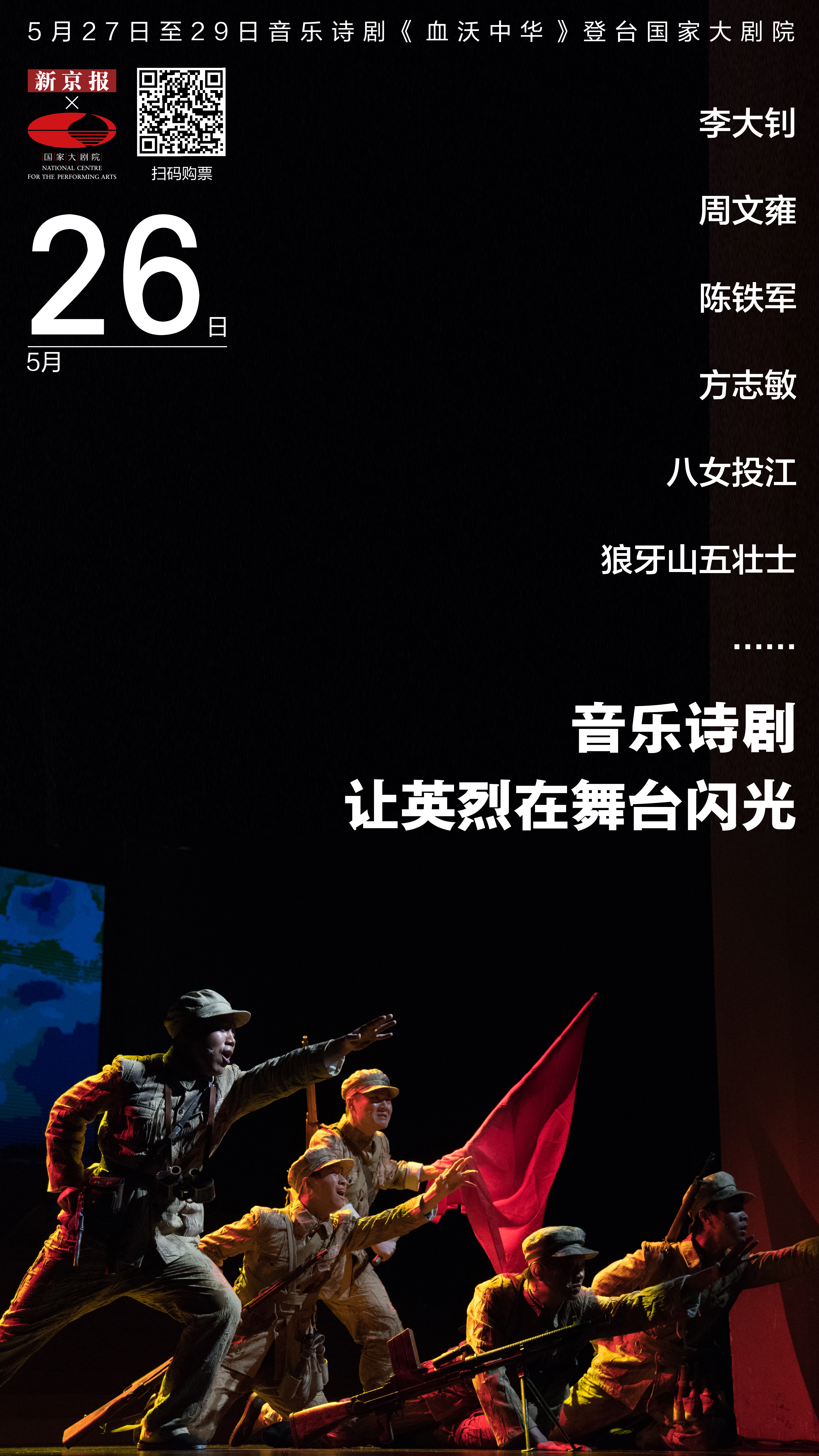 李大钊、周文雍、陈铁军、方志敏、八女投江、狼牙山五壮士、杨开慧、左权、赵一曼、江姐、刘胡兰、董存瑞,这些名字将在一部音乐诗剧里重新动情闪耀,用舞台讲述英雄故事。5月27日至29日,音乐诗剧《血沃中华》登台国家大剧院,其中靳东饰演李大钊、刘昊然饰演董存瑞,郭凯敏、贾雨岚、杜宁林等优秀演员也齐聚此戏。