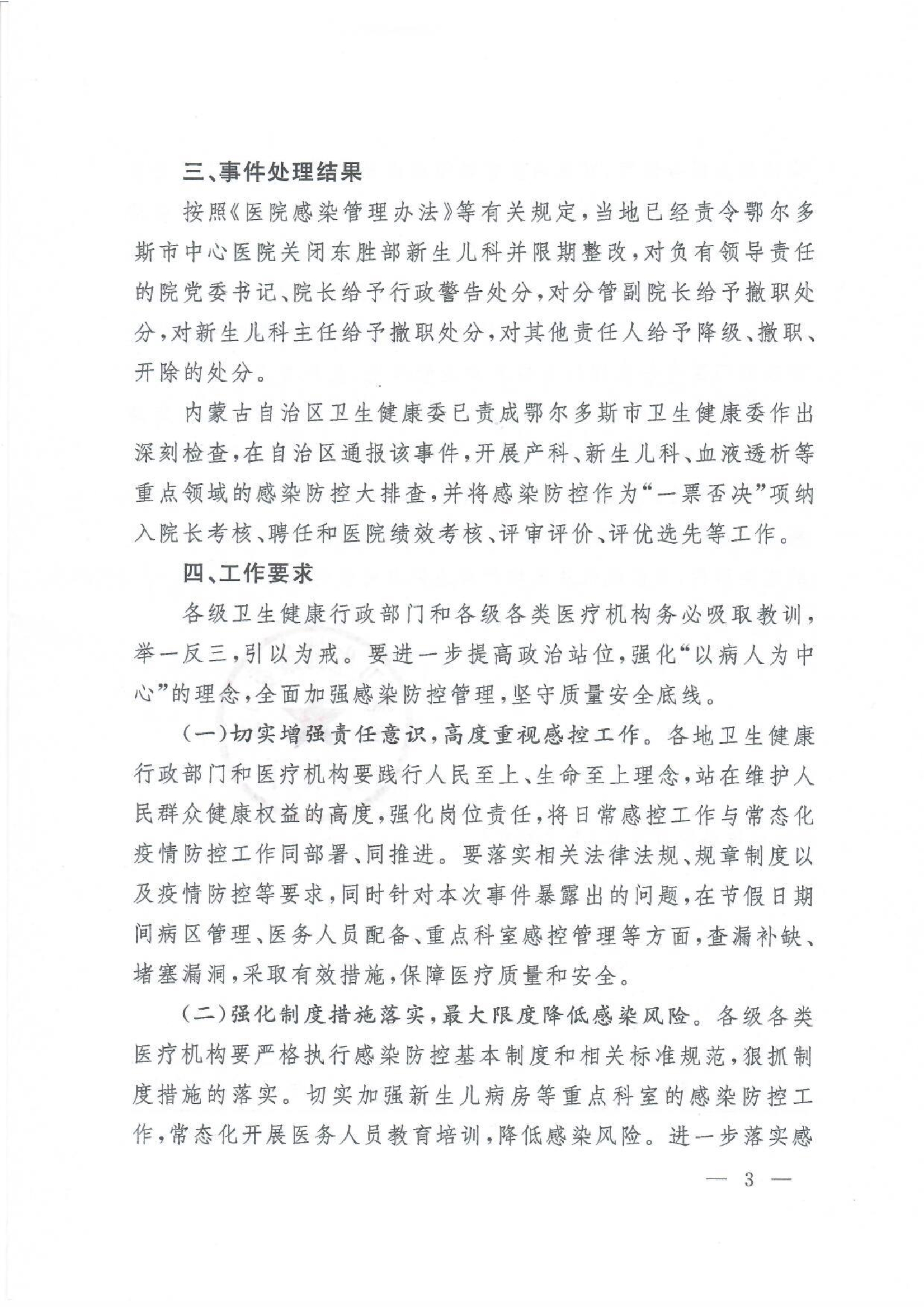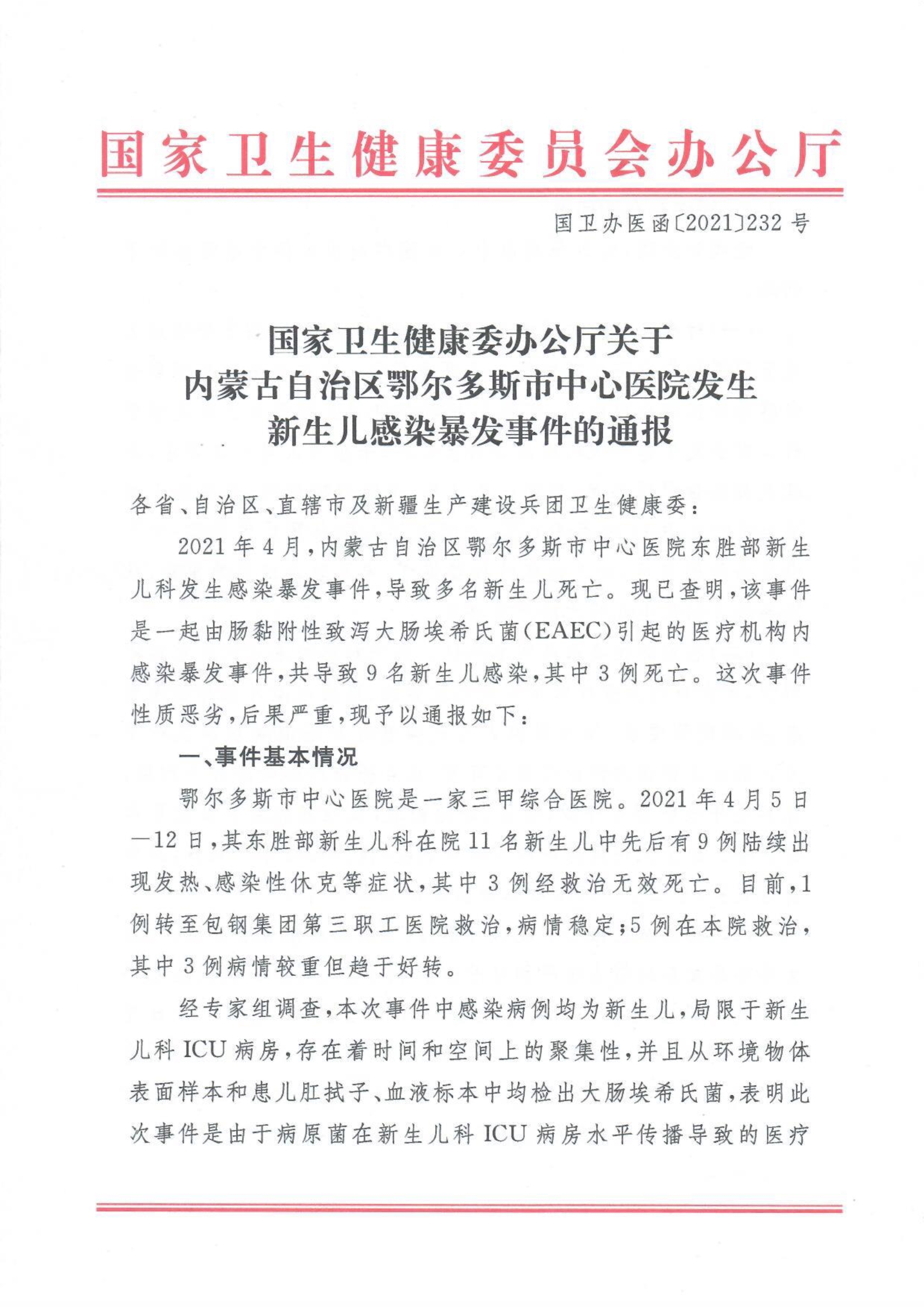 该通报称,2021年4月,内蒙古自治区鄂尔多斯市中心医院东胜部新生儿科发生感染暴发事件,导致多名新生儿死亡。现已查明,该事件是一起由肠黏附性致泻大肠埃希氏菌(EAEC)引起的医疗机构内感染暴发事件,共导致9名新生儿感染,其中3例死亡。这次事件性质恶劣,后果严重。通报全文如下: