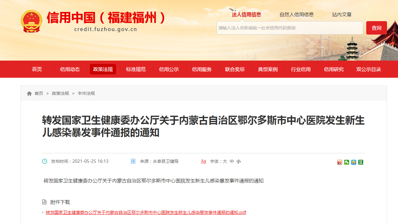 新京报快讯 据信用中国(福建福州)网站消息,福建省福州市永泰县卫健局近日作出《转发国家卫生健康委办公厅关于内蒙古自治区鄂尔多斯市中心医院发生新生儿感染暴发事件通报的通知》。这份通知显示,国家卫生健康委办公厅4月25日作出《关于内蒙古自治区鄂尔多斯市中心医院发生新生儿感染暴发事件的通报》。