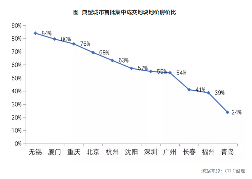 根据克而瑞对热点集中供地城市的盘点,从盈利情况来看,结合周边3公里范围内在售住宅项目的平均售价测算,结果发现:市场热度较高的无锡、厦门、重庆、杭州等城市,“地房比”(地价占房价的比重)高达七成,盈利空间相对较小。