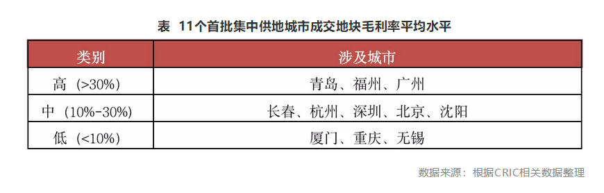 不仅如此,据克而瑞测算,在对11个首批集中拍地城市测算毛利率后发现,此次土拍仅青岛、福州、广州的毛利率在30%以上,地价上涨明显的无锡、重庆、厦门等城市的毛利率则处于较低水平。其中,在“封顶+高配建”之下,无锡多宗地块甚至大概率面临亏损。