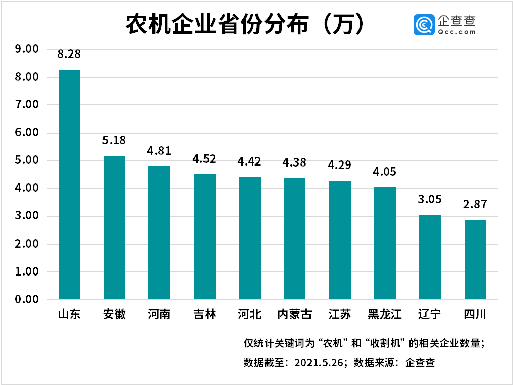 从地域分布来看,企查查数据显示,山东省的农机相关企业数量最多,共8.28万家,安徽、河南、吉林以及河北分别以5.18万家、4.81万家、4.52万家和4.42万家排名前五位。值得一提的是,东三省作为我国的农业发达地区,企业数量均入围前十。
