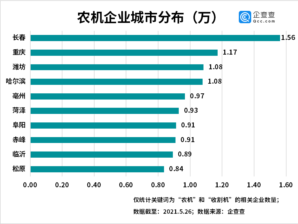 从城市分布来看,企查查数据显示,长春市的农机相关企业数量最多,共1.56万家,重庆、潍坊、哈尔滨以及亳州分别以1.17万家、1.08万家、1.08万家和0.97万家排名前五位。其中山东的潍坊、菏泽以及临沂三市均跻身前十。