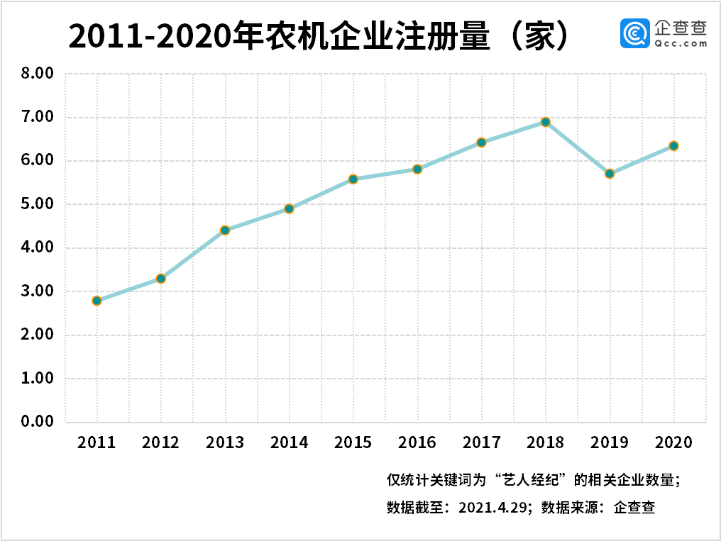 2011年以来的十年之间,农机企业注册量总体呈增长趋势。企查查数据显示,2011年新注册农机企业2.78万家,2018年注册量达到了十年来的最高点,共6.89万家,同比增长7%,2019年和2020年分别注册5.70万家和6.34万家。