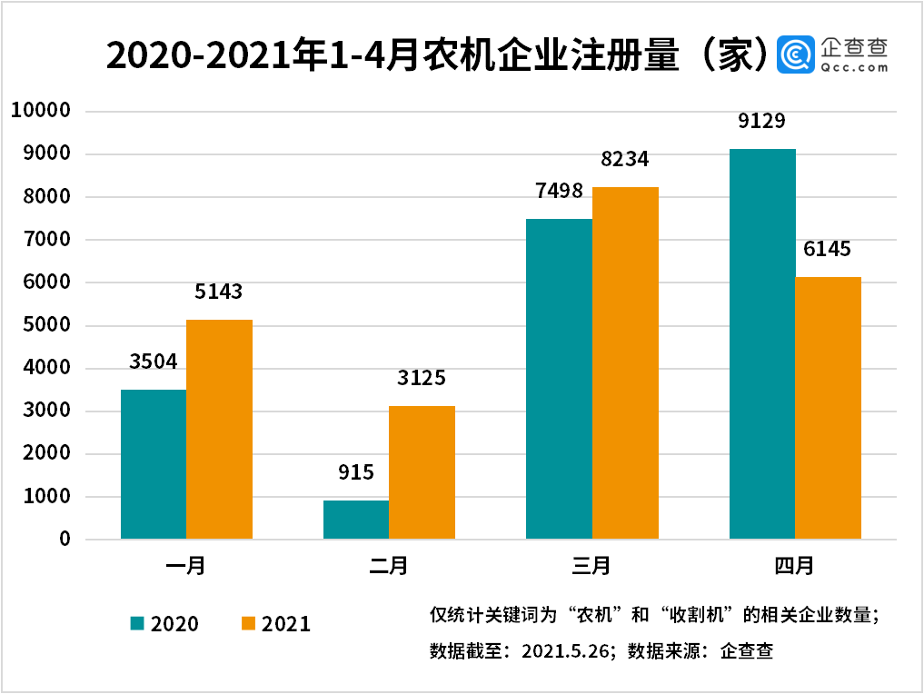 企查查数据显示,2021年前四月共注册农机企业2.26万家,同比增长8%。其中,4月份新注册农机企业6145家,同比下降33%、环比下降25%。