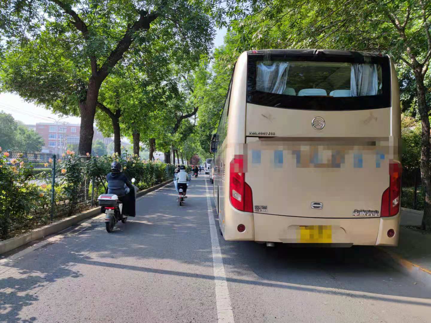 因此,不少自行车、电动车经过被大巴车压缩的自行车道时,不得不减速,偶尔产生三四辆车轻微拥挤的情况。且大巴车会遮挡视线,骑行者很难提前察觉从大巴车间穿过而出的人。