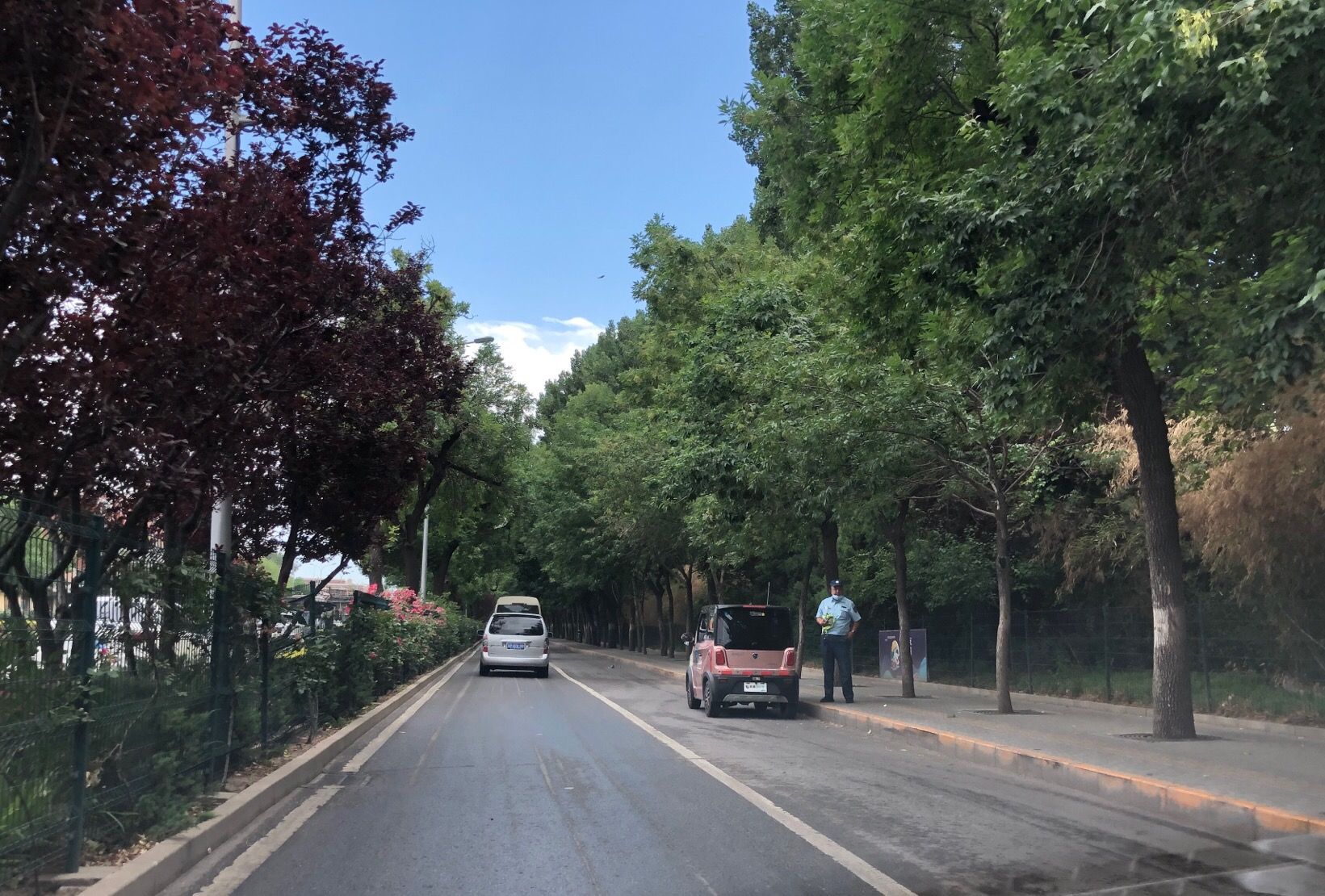 5月27日下午,新京报记者回访该路段发现,已不见有大巴车违章停靠,路边有身着制服的工作人员正在劝离一辆临时停靠的老年代步车。新京报记者 张静姝 摄