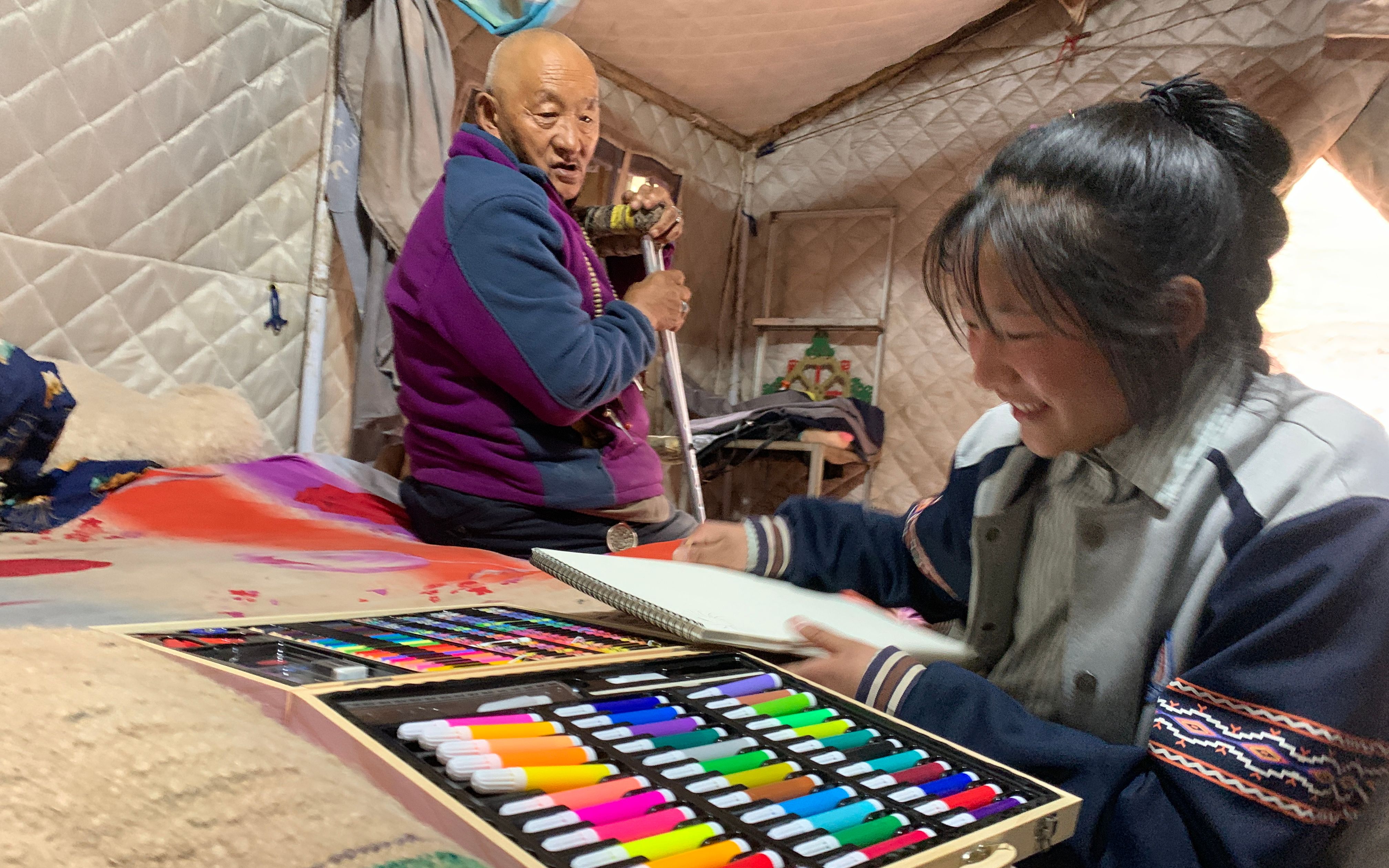 尼措与邻居爷爷相依为命,收到画具后喜悦溢于言表。王轲 摄