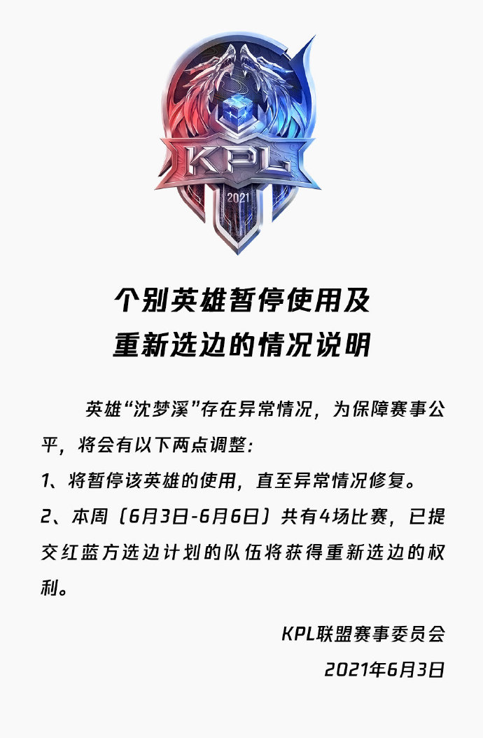 新京报讯 KPL联盟赛事委员会今天下午发布了“个别英雄暂停使用及重新选边的情况说明”。