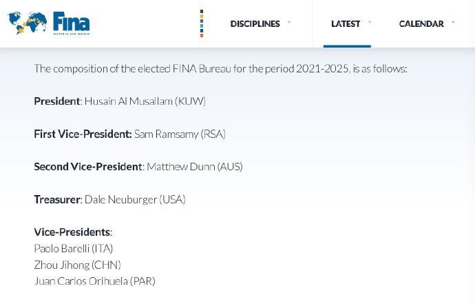 周继红当选国际泳联历史上第一位女性副主席。网络截图