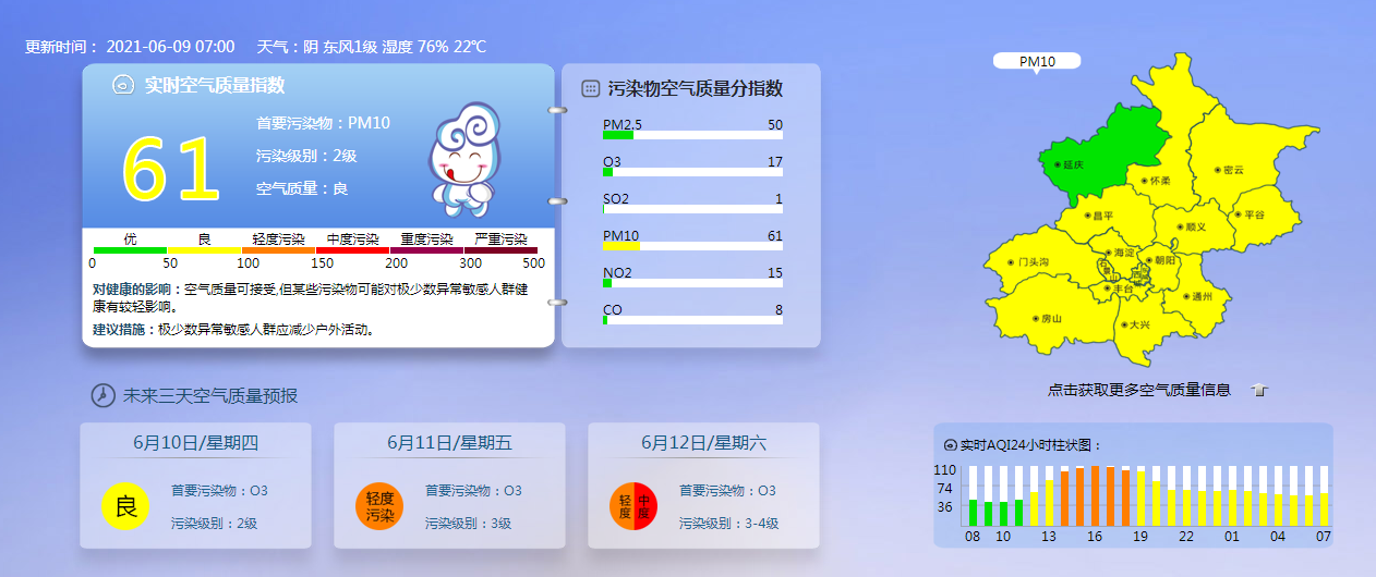 据北京市生态环境监测中心今早7时数据,目前实时空气质量指数为61,首要污染物PM10,污染级别2级,空气质量为良。