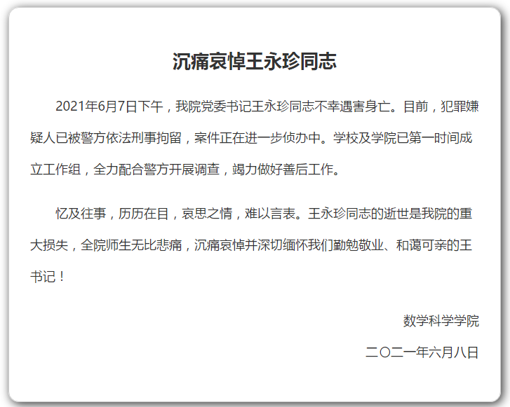 新京报快讯 据复旦大学数学科学学院消息,数学科学学院党委书记王永珍同志不幸遇害身亡。